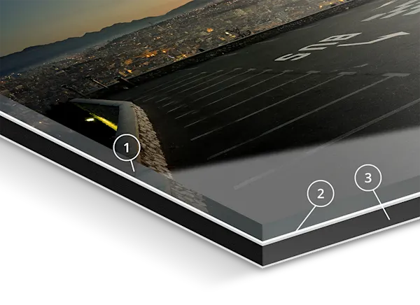 ![]() | • 1 PLEXIGLASS Crystal-clear • 2 PHOTO PAPER Seamless printing on in-house developed paper and permanently elastic silicone • 3 PANEL Extremely stable black Dibond aluminum backing | |