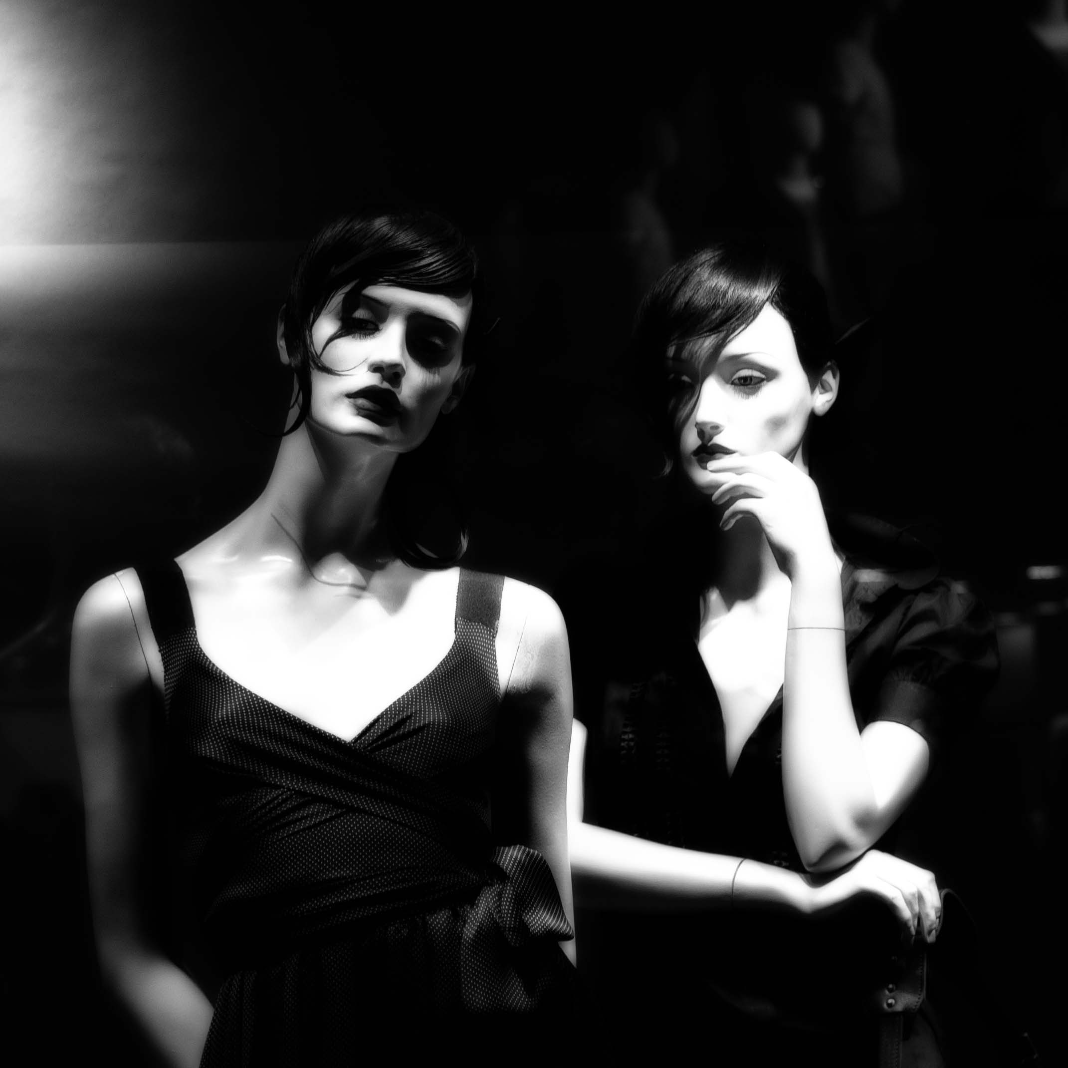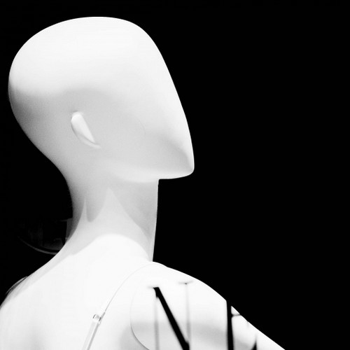 The high‑contrast black and white amplifies the sensation of a suspended space: a place where distinctions between real and artificial, presence and display, individual and object dissolve. Light sculpts these forms as if they were alive, while their stillness reveals another truth: this is a simulated, immaculate, controlled form of life.